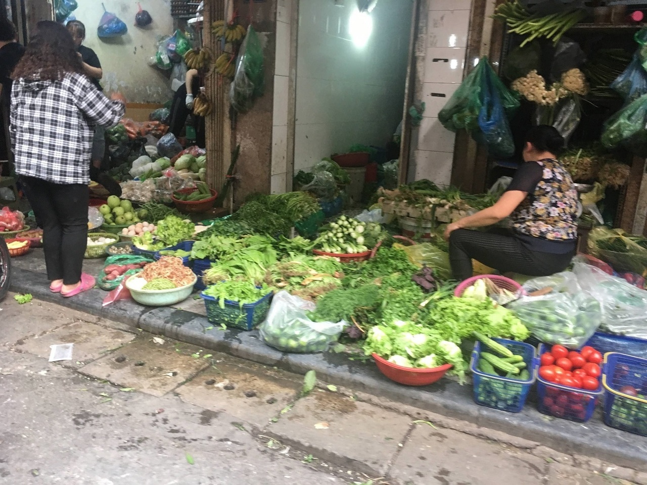 ハノイ中心街の八百屋さんと果物屋さんです。